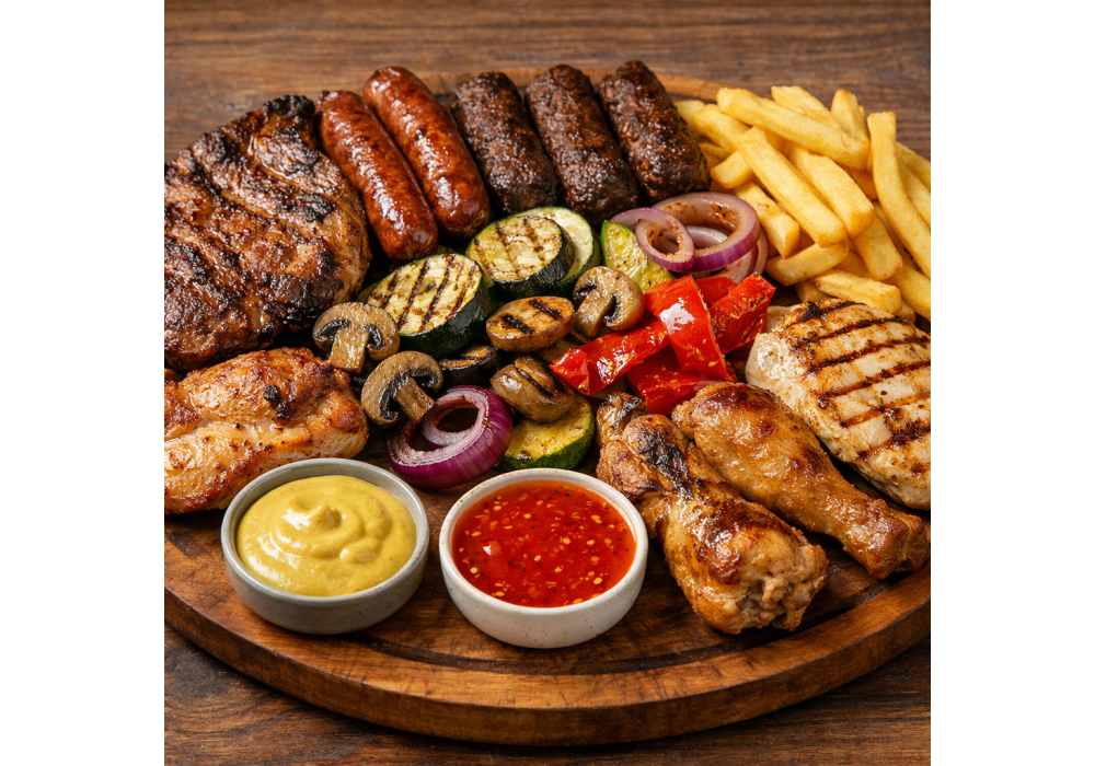 - ceafă de porc, mititei, cârnăciori, piept de pui, pulpă de pui, cartofi prăjiți, legume la grill, bere sau răcoritoare