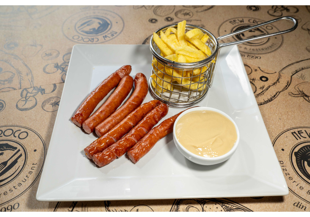 - cârnaciori înveleți în speck, cartofi prăjiți, sos și băutură la alegere